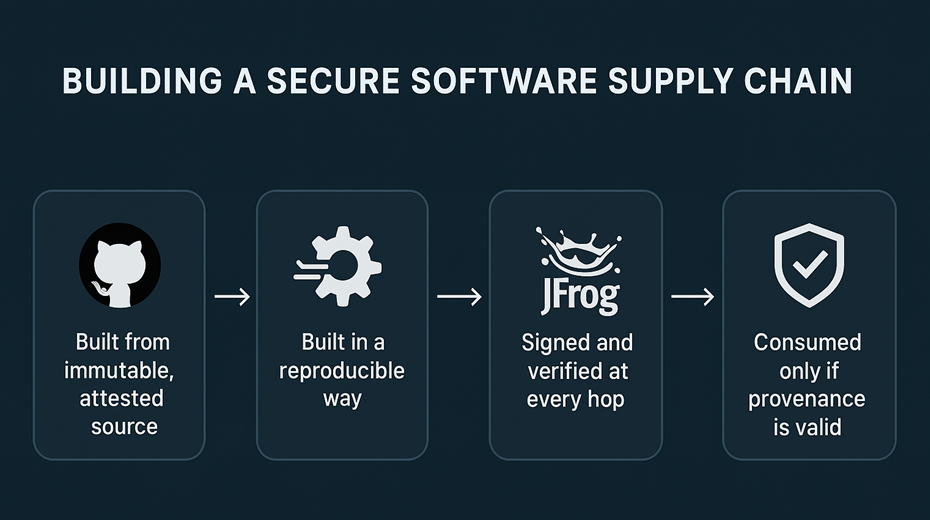 - Attestation: GitHub OIDC authenticates the build; JFrog BuildInfo locks it.